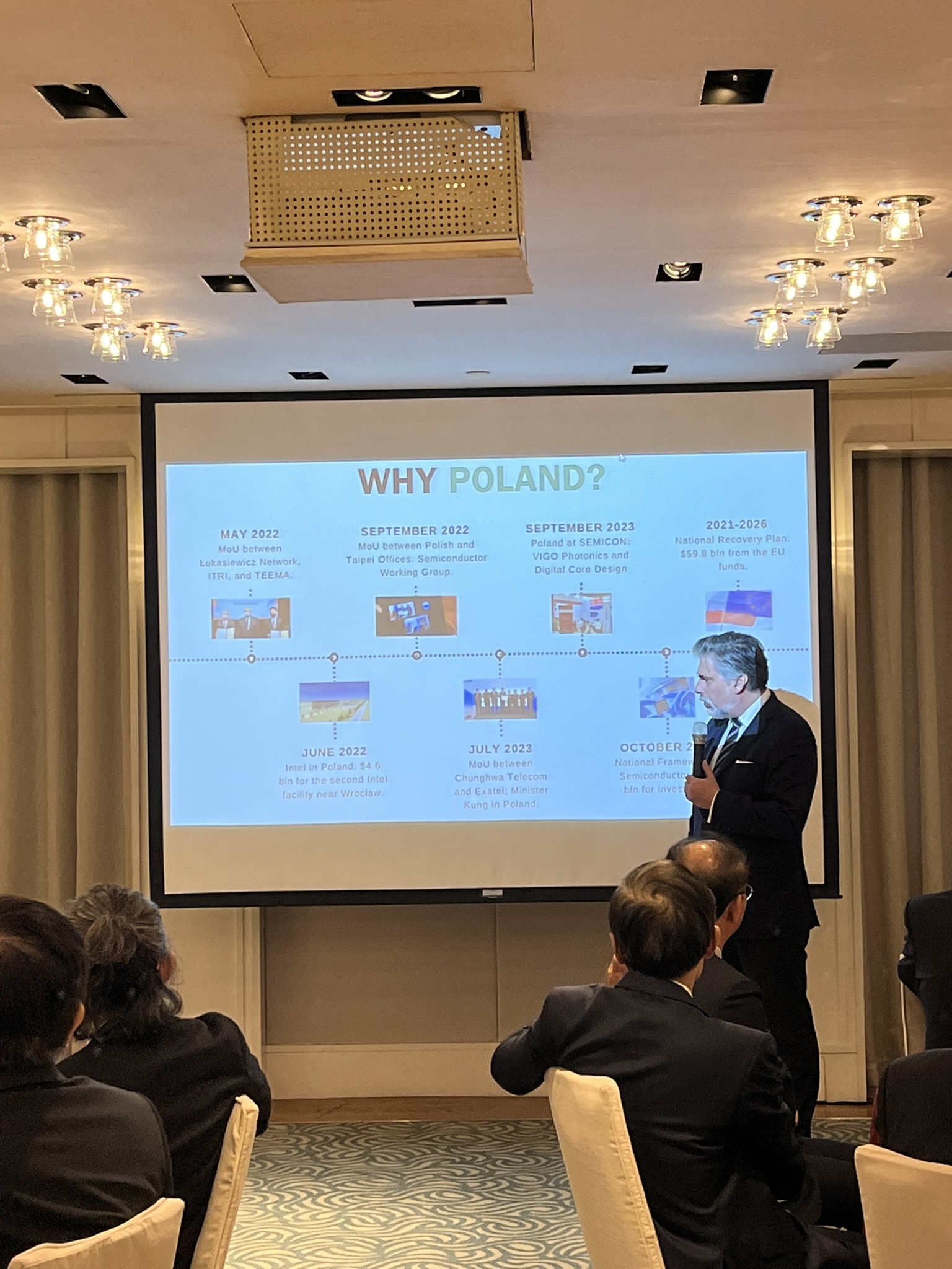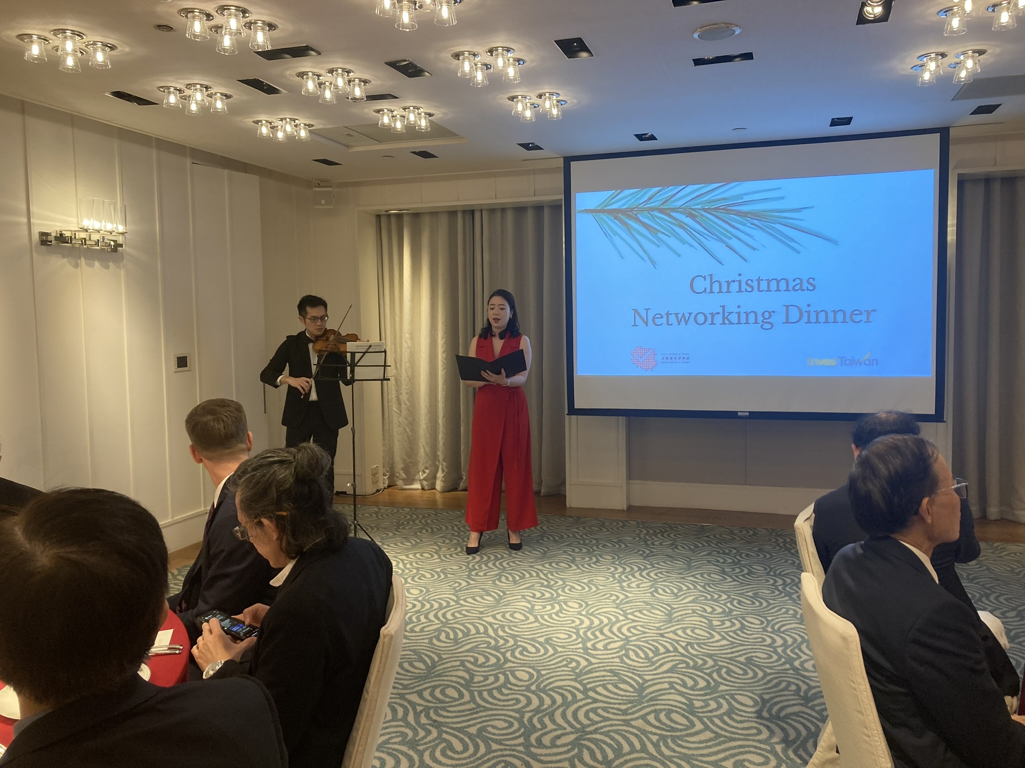 On December 20, 2023, Polish Office in Taipei, in cooperation with the Taiwanese investment promotion agency InvesTaiwan, organized a Christmas business dinner for representatives of the Taiwanese high-tech and financial sector and companies involved in cooperation with Poland or interested in such cooperation. The dinner was accompanied by a performance of Taiwanese musicians - a violinist who played a piece by Henryk Wieniawski (Polonaise Brillante from the Violin Concerto No. 2), and a duet of a violinist and a sopranist who performed the Christmas carols "Silent Night" and "Bóg się rodzi". During dinner, traditional Polish dishes were served (including Ruthenian dumplings, cucumber soup and cream pie).